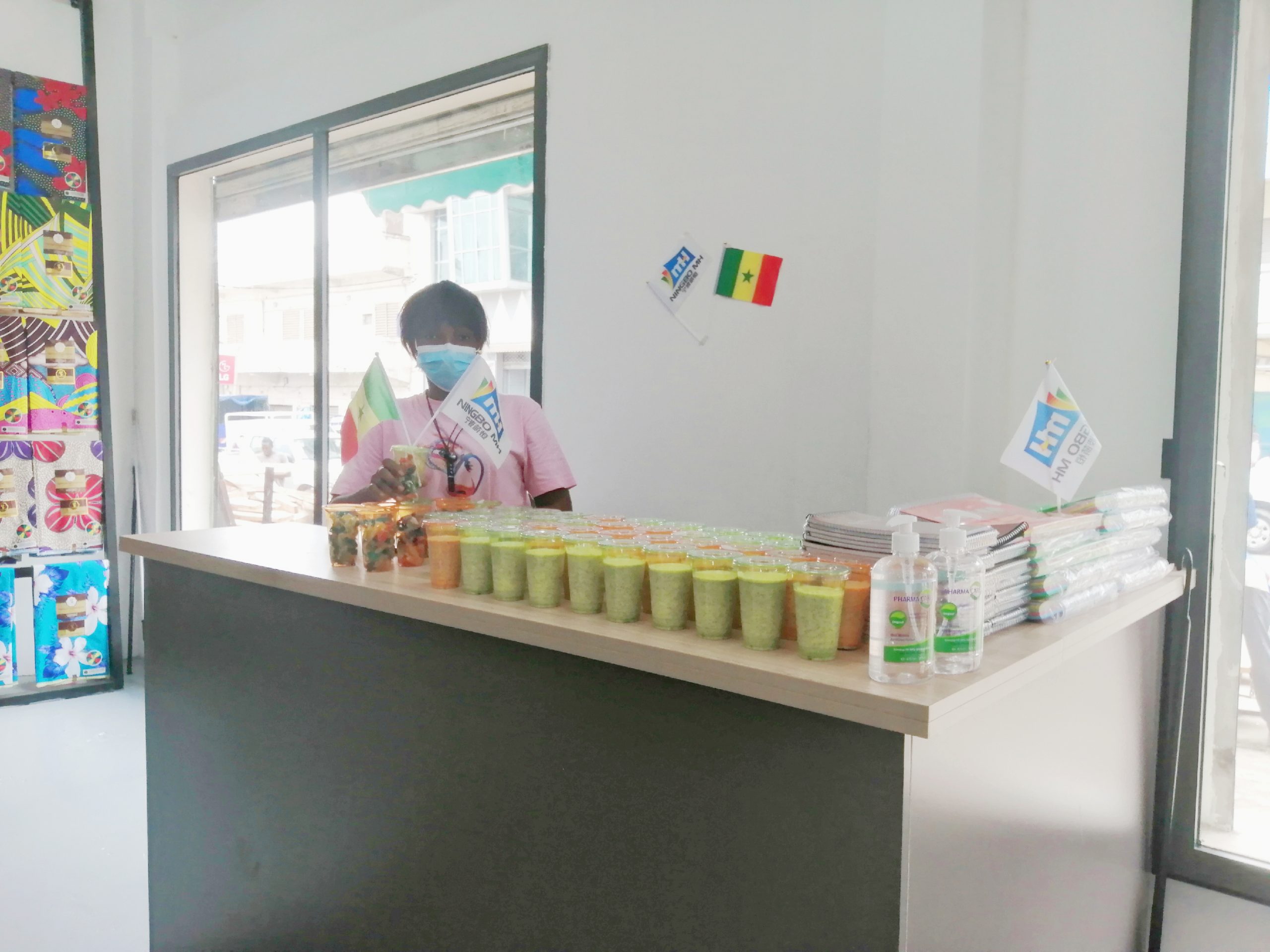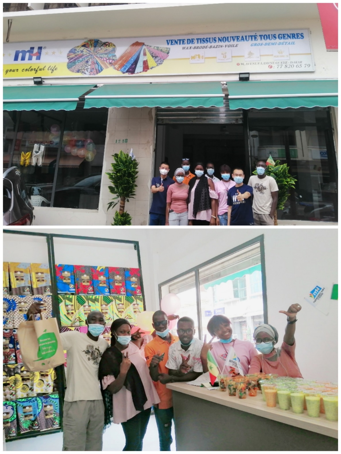 2021年8月16日,海外事業部在塞內加爾達喀爾市區的蠟布/連片店鋪正式開業。開業當天全體員工穿戴整潔,早早地來到店鋪,為正式亮相做好準備。
