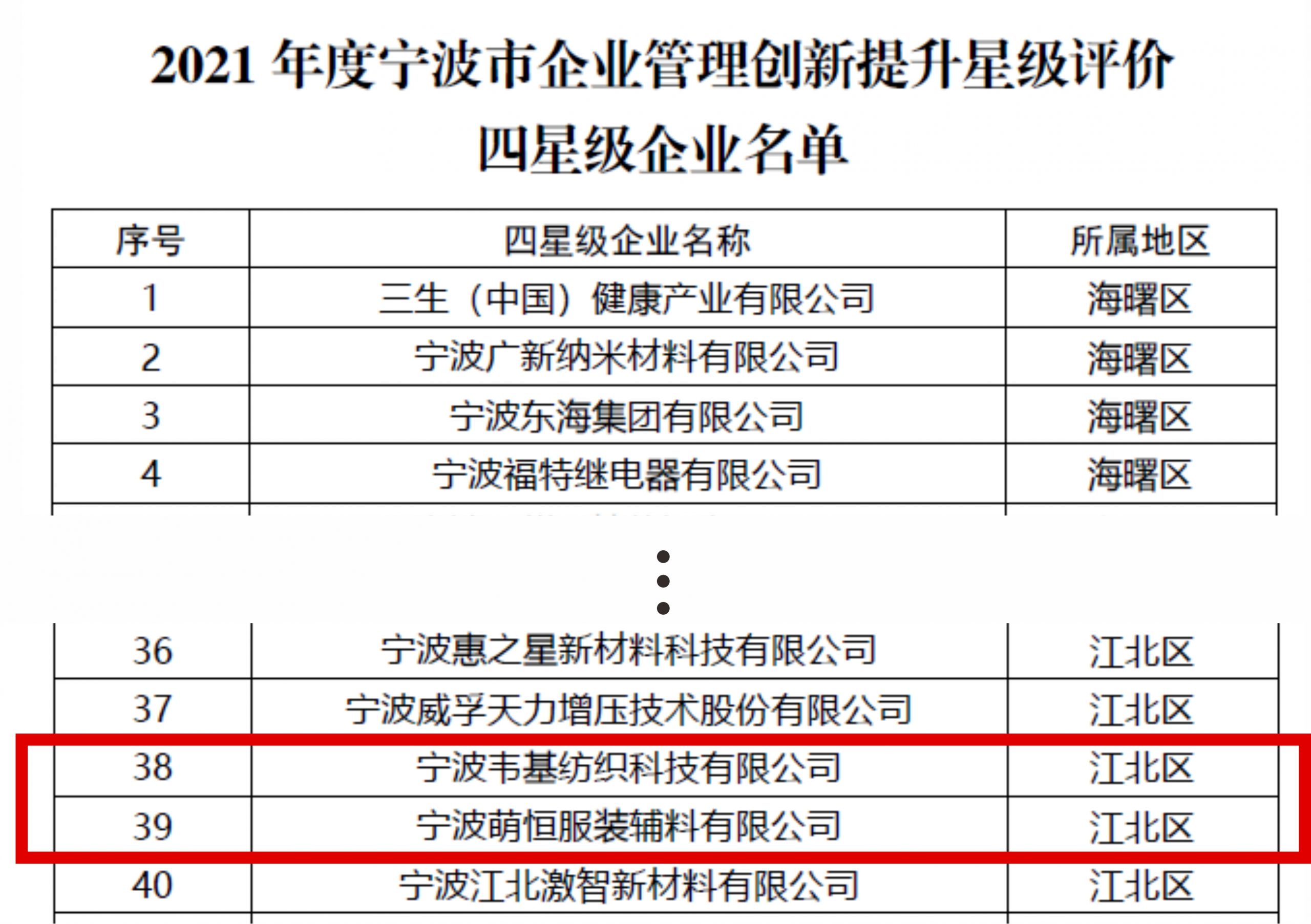 韋基紡織科技有限公司、萌恒服裝輔料有限公司獲批寧波市企業管理創新四星級企業
