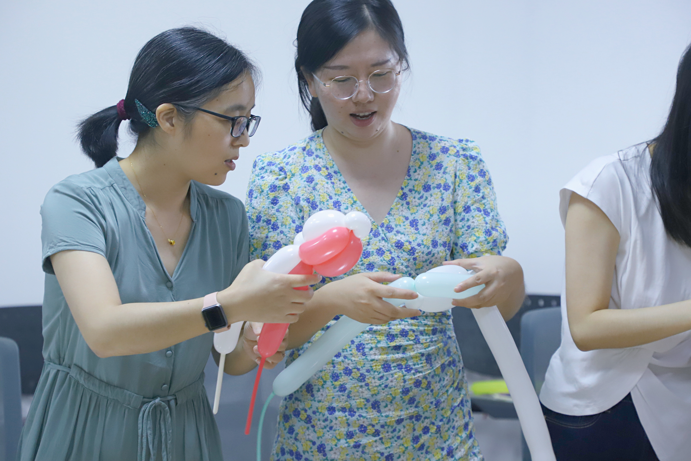 一只萌趣可愛的氣球兔,可以成為一份有心意的禮物,亦可以飽含滿滿的中秋祝福,擁有一只屬于自己的氣球兔,誰會不羨慕呢~9月9日,國貿事業部迎中秋“玉兔氣球DIY”活動如約而至。 五彩的氣球構建了最美的夢,受邀的專業老師向大家分享了如何打氣球、綁氣球的知識點,講解氣球造型的基本技巧,幫助大家把握氣球旋轉的方向和力度,在老師的幫助和指點下,大家很快投入到了動手制作中,從一開始的生疏、害怕氣球爆炸到慢慢掌握了基礎手法,粘膠、拼貼、配色加上自己的一些奇思妙想,雖不時有氣球“嘭嘭”爆破的聲音,但大家熱情高漲,時間不知不覺過去,一件件作品也逐漸呈現在眼前,看似相同卻也不盡相同。 每只氣球玉兔都代表著萌恒人的美好希冀,也讓大家在手作體驗中,感知傳統文化精粹,中秋月當空,希望這些萌趣的小兔子,能夠承載我們最美好的回憶。
