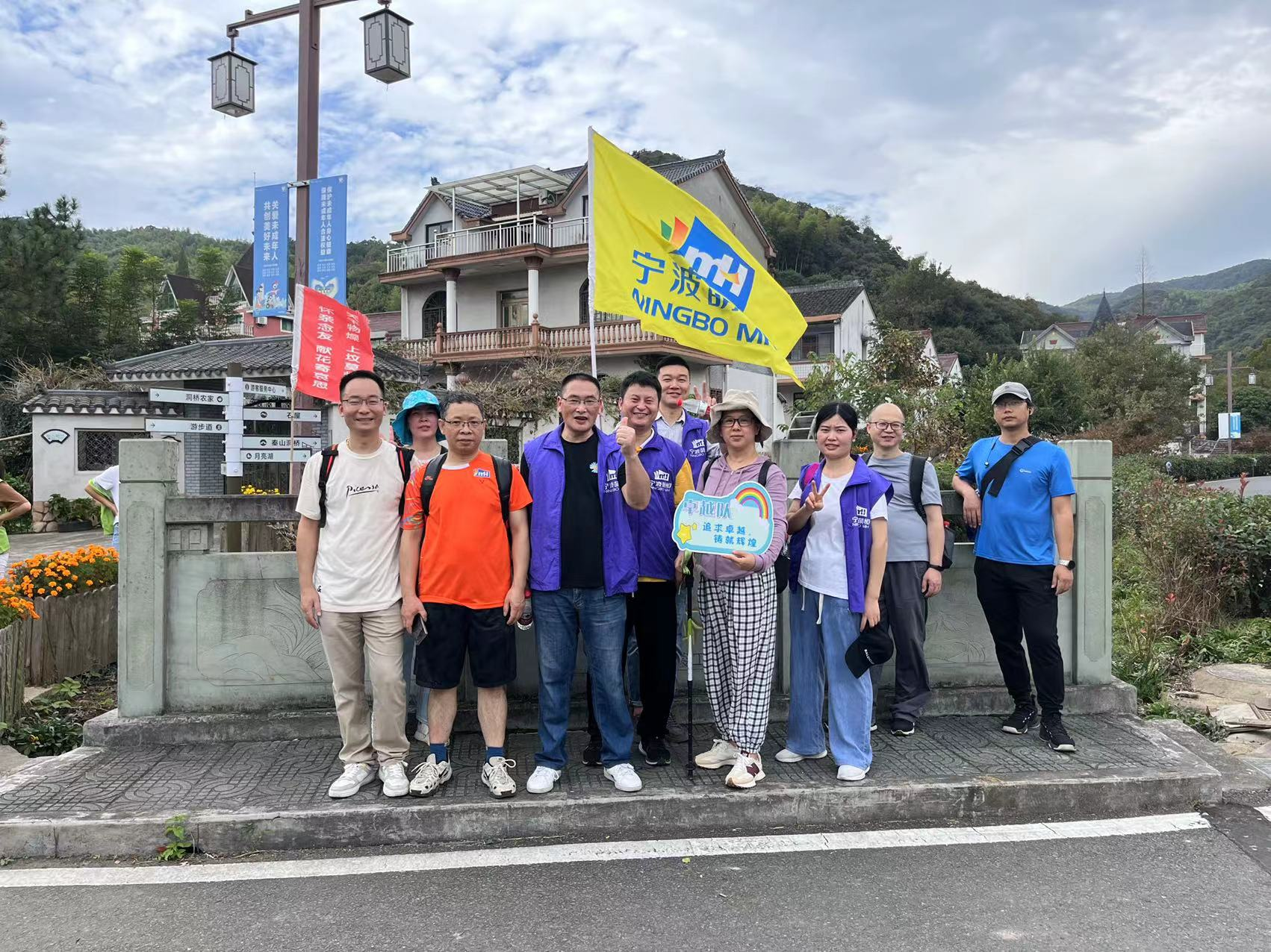 早上8點(diǎn),10支隊(duì)伍的130多名萌友準(zhǔn)時(shí)在洪塘基地辦公樓前集合,由領(lǐng)隊(duì)帶領(lǐng)大家做熱身運(yùn)動(dòng)。熱身結(jié)束后,簡(jiǎn)短地宣講了徒步中的注意事項(xiàng),拍完集體大合照,全員就乘坐大巴車奔向本次徒步團(tuán)建的第一站——毛力水庫(kù)。