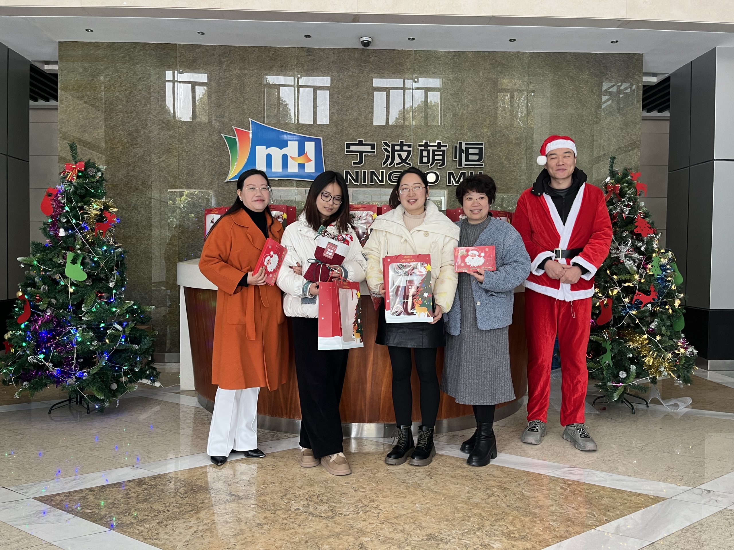 圣誕節前夕,國貿事業部就裝點一新,迷你雪松、精美花環、圣誕老人、圣誕樹…..隨處可見的圣誕元素,烘托出了濃濃的節日氛圍。12月25日一大早,國貿事業部的三位“圣誕老人”,就等在公司大廳為每一個上班的小伙伴,送上了圣誕禮包。禮包芯意滿滿,除了一只寓意平安的紅蘋果,還有一塊“暗藏玄機”的小餅干。掰開餅干,一句句美好的祝福映入眼簾?!霸谑フQ愿你漂亮又甜蜜”“在圣誕愿你金玉滿堂”“在圣誕愿你未來皆坦途”“在圣誕愿你幸福一輩子”。祝愿分別對應不同的禮物。大家在收獲祝福的同時,也收到了驚喜感滿滿的禮物,臉上都綻放了喜悅的笑容。