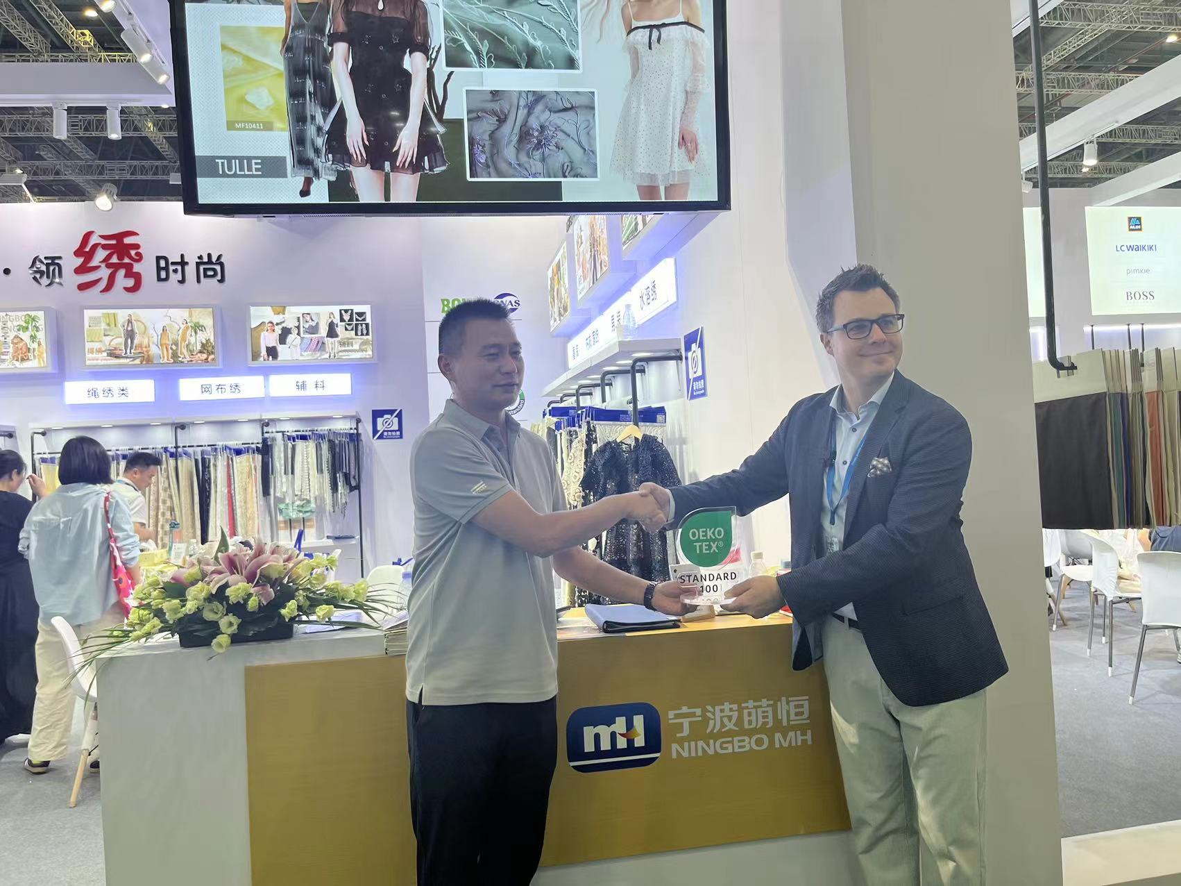 展會現場,公司展位吸引眾多國內外客商駐足,工作人員以扎實的專業知識和豐富經驗,為參展客商進行詳細而耐心的講解,彰顯了公司團隊專業素養與服務水平,為客戶留下深刻印象,增強了客戶對我們品牌的信任與認可。參展期間,瑞士OEKO-TEX公司相關負責人還蒞臨現場,為萌恒親自授牌,進一步認證了我們產品的綠色、環保、健康、安全。