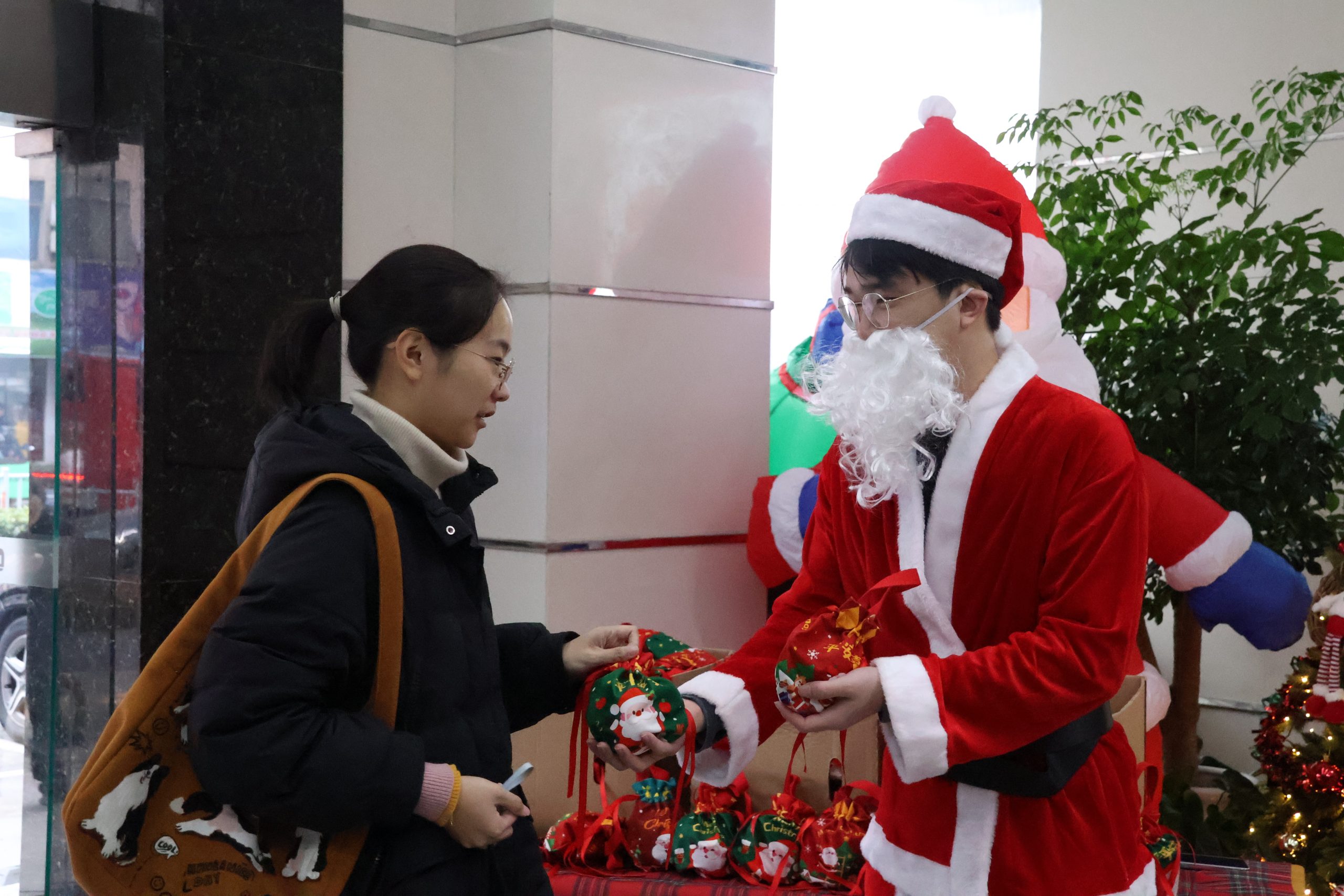 12月25日,國貿(mào)事業(yè)部的工作人員早早守候,化身圣誕老人,將一份份“蘋” 安果禮袋送到大家手中。紅蘋果在晨光下閃耀,糖果散發(fā)著甜蜜氣息,掃碼抽獎的小賀卡暗藏驚喜,為新的一天注入滿滿活力,開啟專屬于萌恒人的圣誕好運。中午時分,一樓大廳瞬間成為歡樂的海洋,萌態(tài)十足的黃油小熊,一出場就吸引了小伙伴們的目光。大家紛紛前來與小熊擁抱、互動、合影。它搞怪的動作、溫暖的 “熊抱”,?引來笑聲連連,傳遞別樣的活力與溫馨。