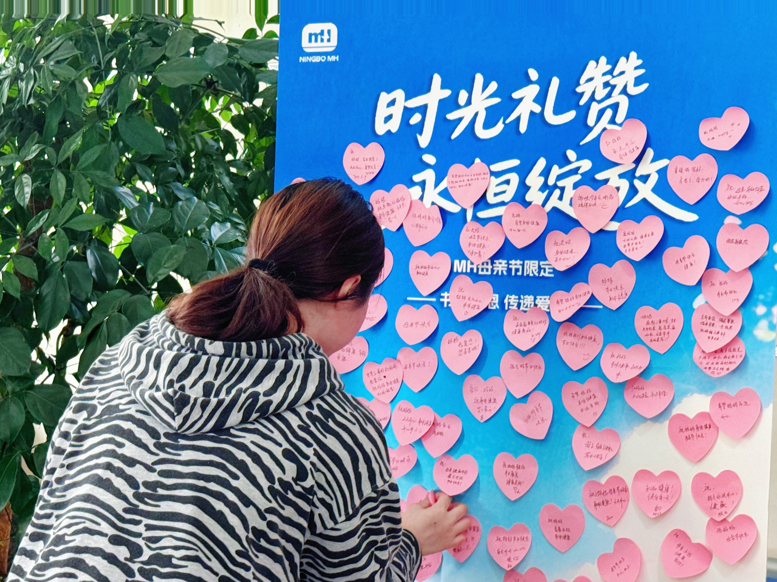 一樓大廳同樣熱鬧非凡,小伙伴們在愛心便利貼上紛紛寫下對媽媽的祝福,并張貼在留言板上。那些真摯的文字,定格了我們對媽媽的溫情告白。還有小伙伴感言道:”好巧,今天剛好是我媽媽的生日,這也太有儀式感了。”說完就拿出手機拍下祝福,將這份心意實時傳遞給媽媽。