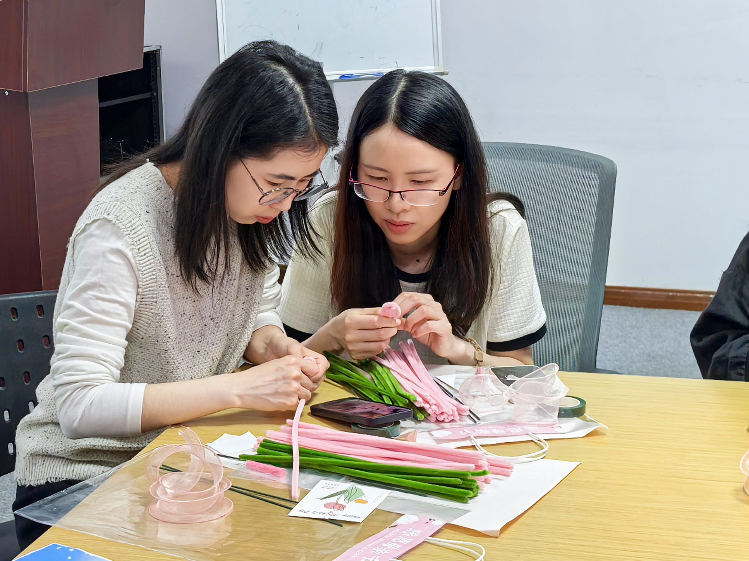 5月9日中午,活動現場滿是溫馨的氣息。小伙伴們圍坐在一起,桌上擺放著粉色的扭扭棒、綠色的鐵絲和精致的包裝材料。制作開始,大家先將扭扭棒彎折成郁金香花瓣的形狀,有的手法嫻熟,三兩下就勾勒出優美的花瓣弧度;有的則略顯生疏,反復調整。這時,“互助模式”?自發開啟,原本有些困難的制作過程變得輕松有趣,現場溫馨祥和。