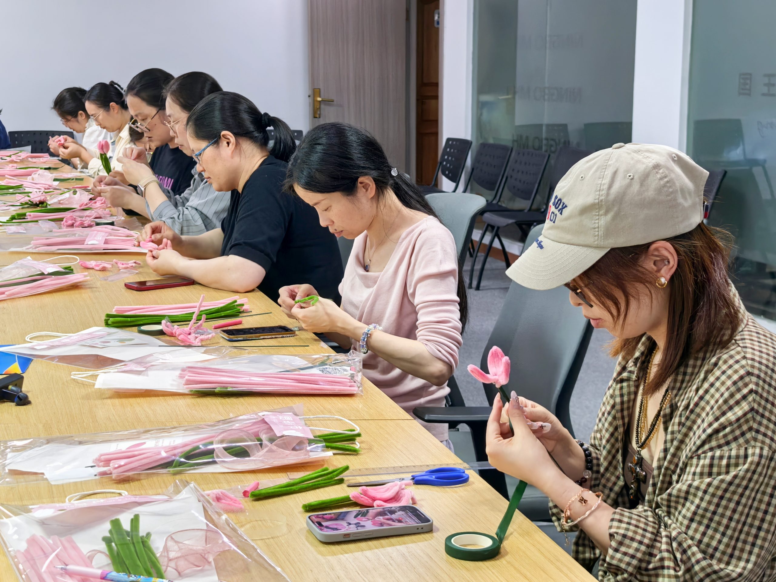 經過一個小時的努力,一朵朵粉嫩的郁金香在指尖逐漸綻放。耐心制作、細心包扎,精美的花束承載著我們對母親的深情。那一刻,我們不僅是職場人,更是一群想要把愛意傳遞給母親的孩子。或許我們不善言辭,但指尖的溫度會替我們訴說——那些藏在心底的感謝,那些未能常伴左右的歉意,還有那份永遠不變的牽掛。