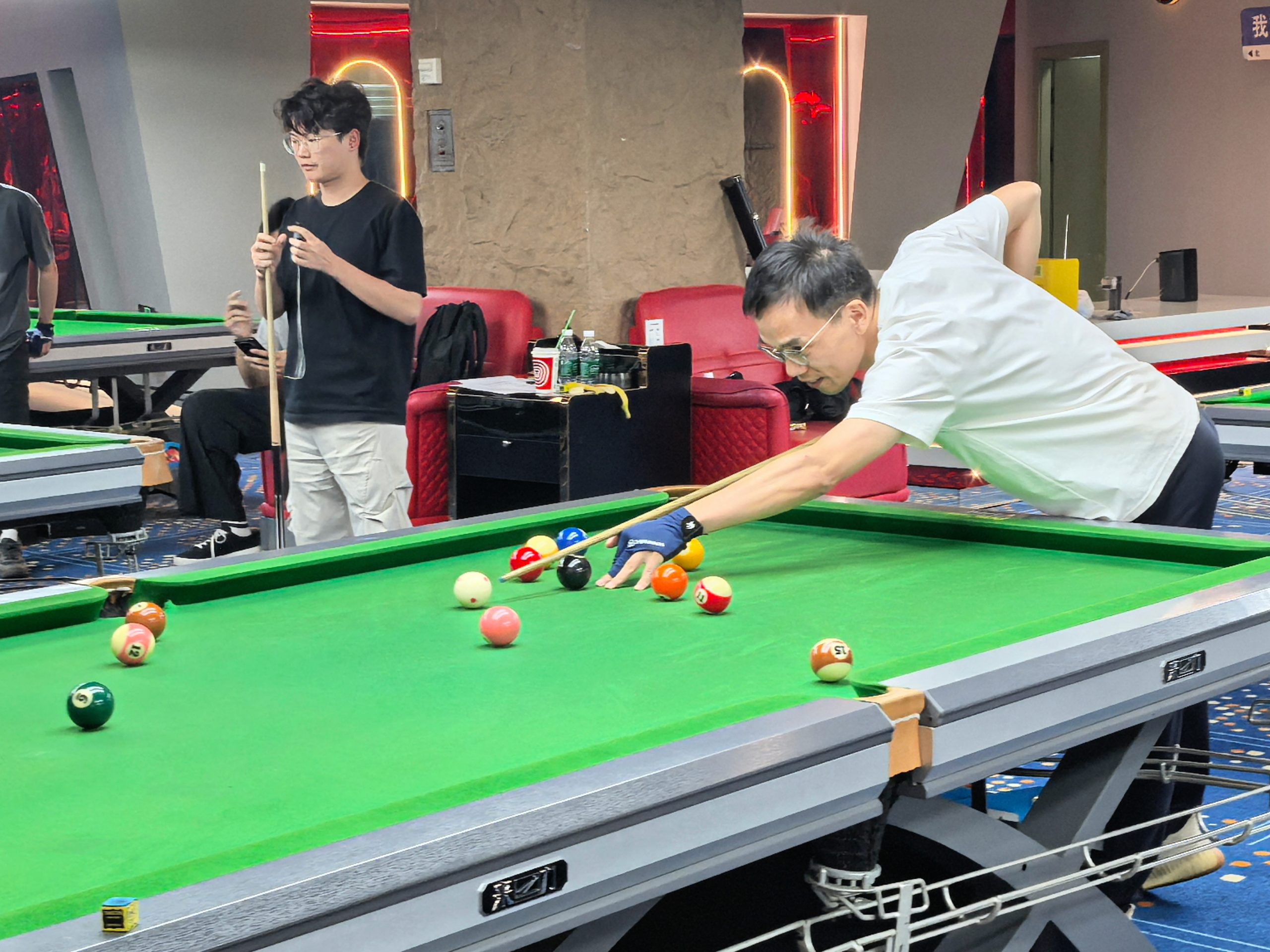 賽前的趣味互動環節短暫預熱,“爭分奪秒”的協作比拼與“趣味推桿”的精準考驗,快速調動起現場氛圍,中式八球個人賽順勢拉開序幕。第一階段小組循環賽,19名選手被分為四組,組內采用“一局定勝負”的單循環制,因此每一場對決都至關重要。賽場上,選手們狀態專注,俯身、架桿、瞄準、出桿一氣呵成。有的選手擅長精準走位,白球在球桌上靈活穿梭,為下一擊創造絕佳角度;有的選手則以防守見長,巧妙避開對手進攻路線,將局勢牢牢掌控在自己手中。經過多輪激烈比拼,每組前2名成功晉級八強。