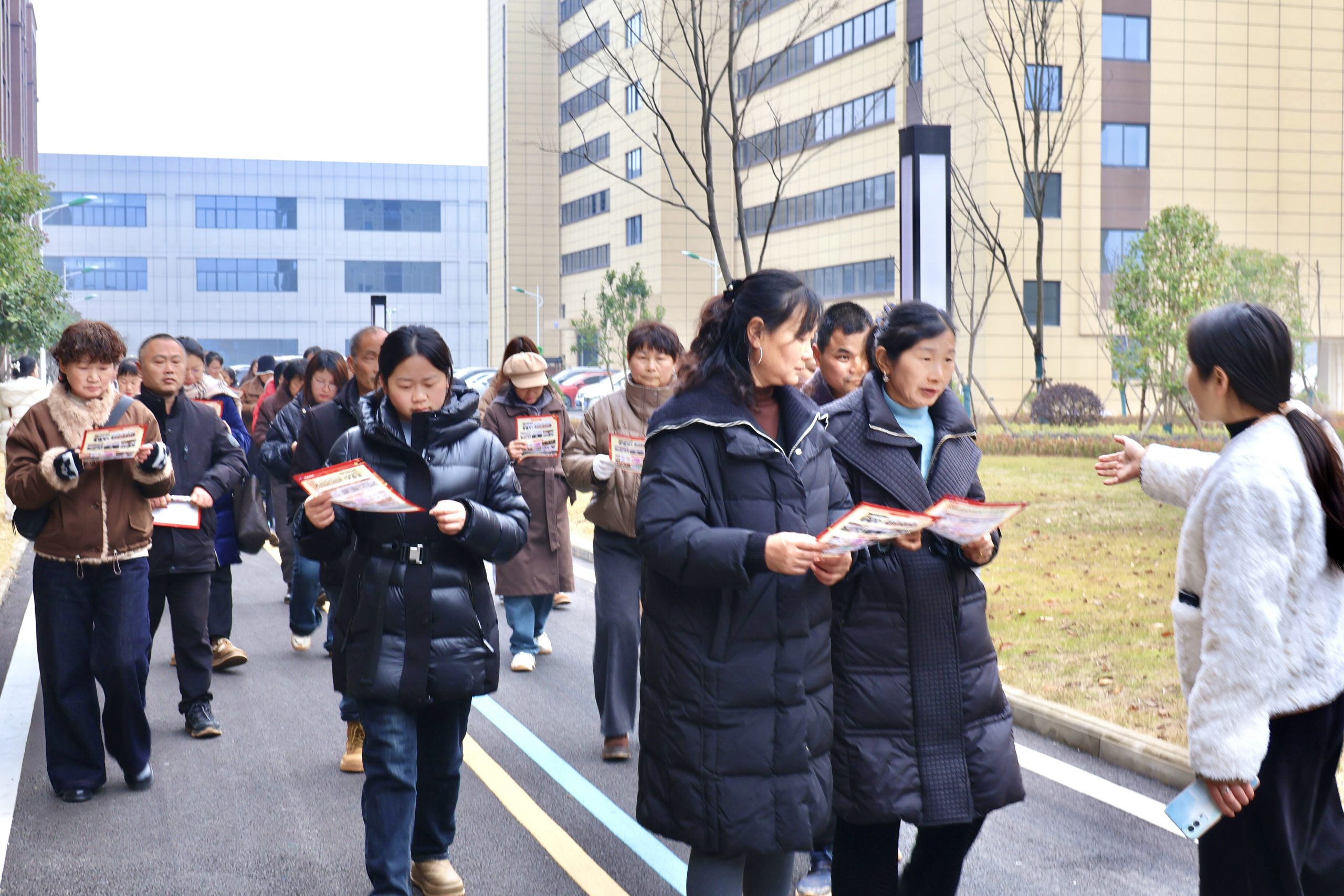 在年貨節活動現場,公司設置了招聘展位,向務工人員詳細介紹崗位需求、薪資待遇與企業環境。隨后在公司的精心安排下,務工人員深入生產一線,依次參觀了擋車、自動化高速機、包裝、電腦繡花、繡補及檢驗等全流程崗位,詳細了解各環節操作內容與技術要求。隨后,參觀人員走進員工食堂、宿舍及廠區環境,實地感受公司整潔有序的生活配套與溫馨和諧的工作氛圍。過程中,不少務工人員與招聘負責人積極溝通,現場氣氛熱烈。參觀結束后,多位務工人員與公司達成初步就業意向。